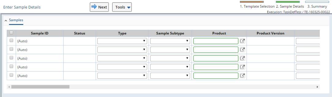 "Enter Sample Details" is a MaintPageStep that lets you edit the Samples. Either a MaintenanceGrid (for multiple Samples as shown below) or MaintenanceForm (for a single Sample) is displayed.