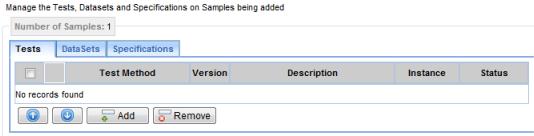 If "Manage Details" is checked, you can add Tests, Data Sets, and Specifications at this time. The Sample List page then loads.
