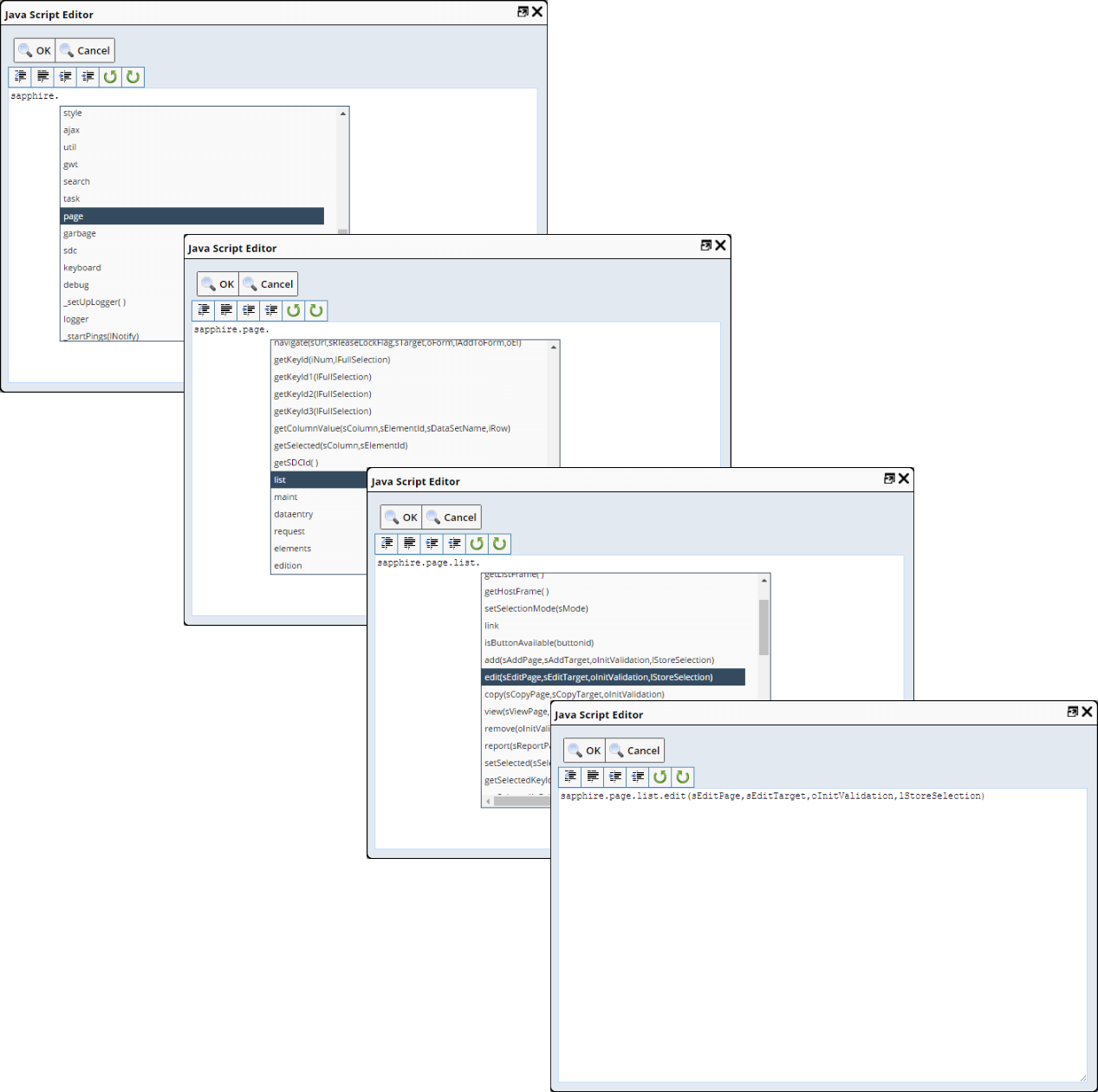 This opens a full-text JavaScript editor. Press Ctrl-Space to see each object available in the JavaScript Global API. Each time you select a branch in the object tree, provide the dot (.) delimiter, then press Ctrl-Space to see the next available branch until you finally get to the methods available for the selected object as shown in the example below, which fires sapphire.page.list.edit (sEditPage,sEditTarget,oInitValidation,lStoreSelection). Replace the property names with their values, and the "edit" method is ready to be called on the sapphire.page.list object.